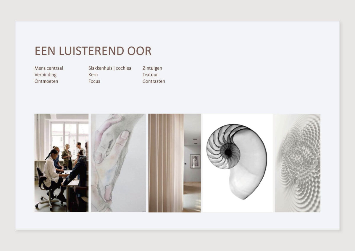 Als inspiratie hebben we de vorm van het slakkenhuis van het oor gebruikt. Dit leidde tot een beweging naar binnen: van de entree naar de kern van het gebouw, waar het onderzoekseiland met audiocabines en onderzoekskamers ligt. Kleur is krachtig ingezet om zones en functies te markeren. Ronde hoeken en vloeiende vormen leiden bezoekers natuurlijk door de ruimte. Verlichting ondersteunt de routing en veel glas in de binnenwanden laat daglicht diep het gebouw instromen. Voor de akoestiek is gewerkt met een combinatie van stucwerk, hout en wolvilten panelen. Een groene zone met beplanting voegt een gezonde, ontspannen sfeer toe.